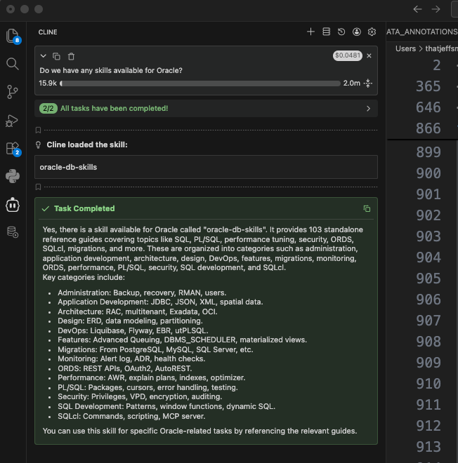 Without reloading my VS Code Cline extension, I simply asked – hey, do we have the skills available for the Oracle task?